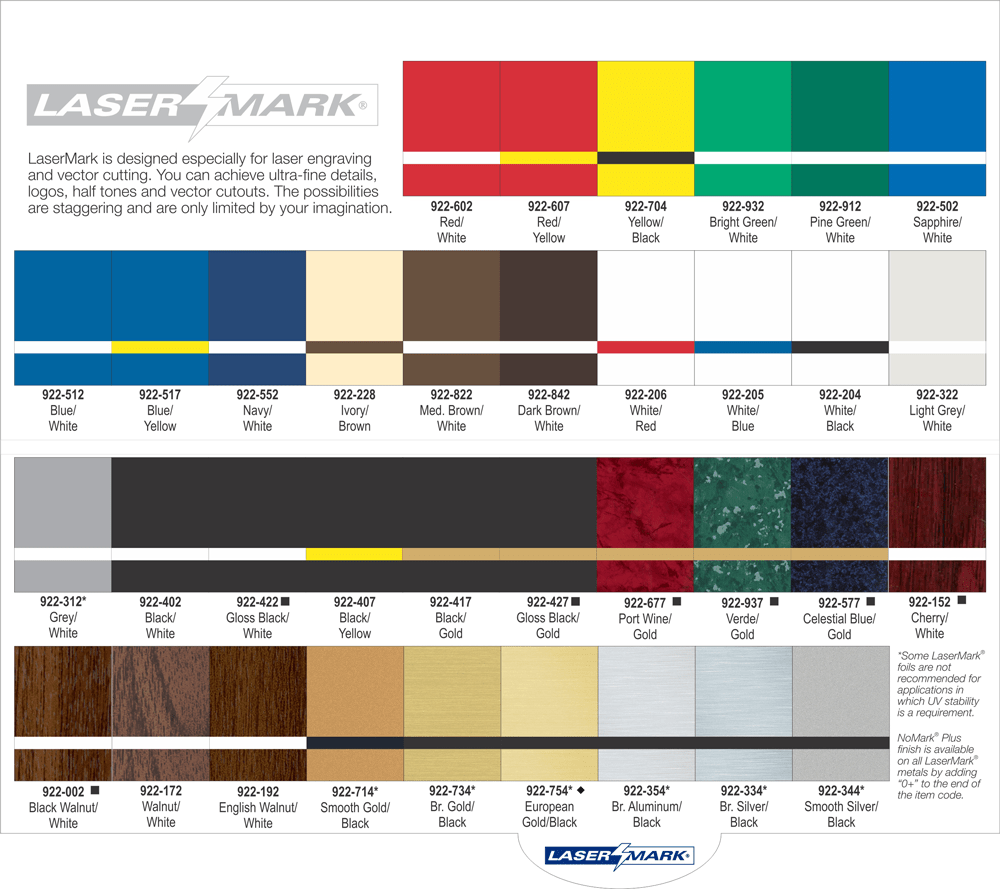 We have a array of colors to choose from for your standard engraving stock needs. We use the latest state-of-the-art computer technology for our laser engravings and art designs. We can provide you various name badges and smaller scaled engraved signs with an assortment of color combinations for your display needs.